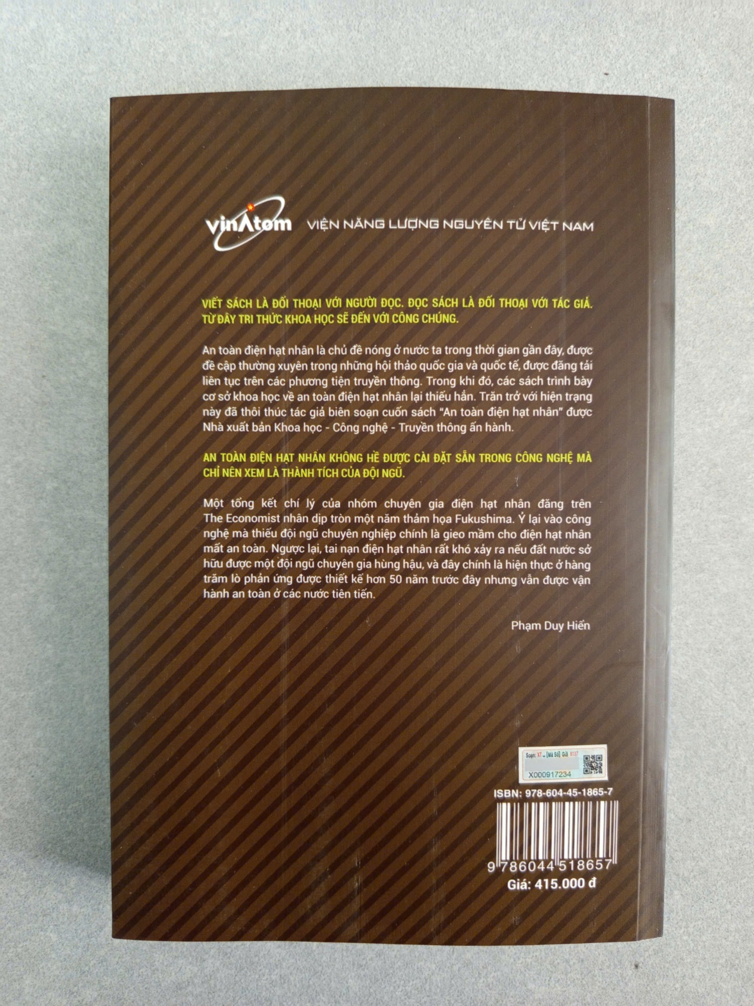 An toàn điện hạt nhân là chủ đề "nóng" ở nước ta trong thời gian gần đây, được đề cập thường xuyên trong những hội thảo quốc gia và quốc tế, được đăng tải liên tục trên các phương tiện truyền thông. Trong khi đó, các sách trình bày cơ sở khoa học về an toàn điện hạt nhân lại rất thiếu. Chính vì sự trăn trở với hiện trạng này đã thôi thúc Giáo sư Phạm Duy Hiển biên soạn sách “An toàn điện hạt nhân”.