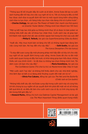 Tư duy đặt cược sử dụng rất nhiều ví dụ hấp dẫn để minh họa cho những công cụ hùng mạnh (và gần như không liên quan gì đến toán học) mà bất cứ ai cũng có thể áp dụng được. Nó sẽ giúp bạn nhận diện những sai lầm may mắn và những khoảnh khắc sáng chói xui xẻo để bạn sẽ ít có nguy cơ bị chiếm lĩnh bởi những cảm xúc phản ứng, thành kiến theo phản xạ và thói quen tiêu cực. Và nó sẽ giúp bạn chiêu mộ được sự giúp đỡ của đồng nghiệp, bạn bè và gia đình trên cuộc hành trình tìm kiếm thành công đang tiếp diễn của mình. Cho dù tương lai có ra sao đi nữa thì bạn cũng sẽ trở nên tự tin hơn, điềm tĩnh hơn và bao dung với bản thân mình hơn khi đối mặt với nó. Không phải lúc nào bạn cũng đưa ra được những quyết định đúng đắn, nhưng bạn sẽ có được một lợi thế lớn hơn rất nhiều so với những người đặt cược bằng cảm giác thay vì bằng trí óc.
