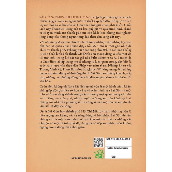 "Sài Gòn - Paris Viễn Đông" là tập hợp những ghi chép của nhiều tác giả trong và ngoài nước từ thế kỷ 19 đến đầu thế kỷ 20 về lịch sử, văn hóa và xã hội của Sài Gòn qua từng giai đoạn phát triển. Cuốn sách này không chỉ cung cấp tư liệu quý giá về quá trình hình thành và chuyển mình của thành phố mà còn khắc họa những trải nghiệm sống động của những người từng đặt chân đến vùng đất này.