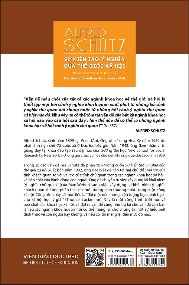 Thông tin tác giả Alfred Schütz Alfred Schütz (1899–1959) là một trong những nhà tư tưởng vĩ đại về khoa học xã hội thế kỷ XX. Sinh ra tại Wien (Áo), ông di cư sang Mỹ năm 1939 để tránh chế độ quốc xã. Năm 1943, Schütz bắt đầu giảng dạy tại New School for Social Research (New York, Mỹ), trở thành giáo sư ngành xã hội học và tâm lý học xã hội từ 1956 cho tới khi qua đời. Là nhà triết học xã hội học, Schütz chính là người đã xây nên cây cầu nối giữa triết học hiện tượng học – với những tên tuổi như Edmund Husserl, Henri Bergson, và Max Weber – và khoa học xã hội hiện đại.