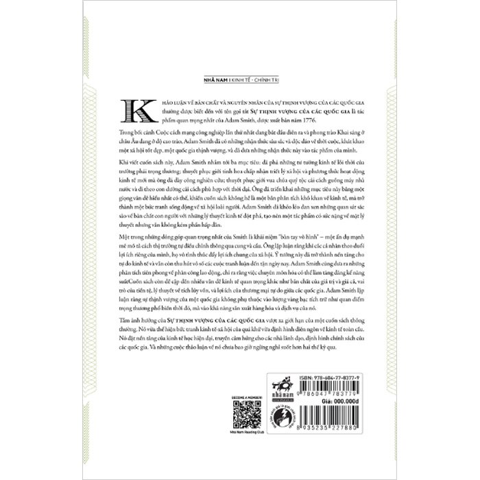 Một trong những đóng góp quan trọng nhất của Smith là khái niệm "bàn tay vô hình" - một ẩn dụ mạnh mẽ mô tả cách thị trường tự điều chỉnh thông qua cung và cầu. Ông lập luận rằng khi các cá nhân theo đuổi lợi ích riêng của mình, họ vô tình thúc đẩy lợi ích chung của xã hội. Ý tưởng này đã trở thành nền tảng cho tự do kinh tế và vẫn còn thu hút vô số các cuộc tranh luận đến tận ngày nay. Adam Smith cũng đưa ra những phân tích tiên phong về phân công lao động, chỉ ra rằng việc chuyên môn hóa có thể làm tăng đáng kể năng suấtCuốn sách còn đề cập đến nhiều vấn đề kinh tế quan trọng khác như bản chất của giá trị và giá cả, vai trò của tiền tệ, lý thuyết về tích lũy vốn, và lợi ích của thương mại tự do giữa các quốc gia. Adam Smith lập luận rằng sự thịnh vượng của một quốc gia không phụ thuộc vào lượng vàng bạc tích trữ như quan điểm trọng thương phổ biến thời đó, mà vào khả năng sản xuất hàng hóa và dịch vụ của nó.
