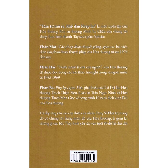 "Tâm từ mở ra khổ đau khép lại” là một tuyển tập của Hoà thượng Bổn sư thượng Minh hạ Châu của chúng tôi đang được hình thành. Tập sách gồm 3 phần: