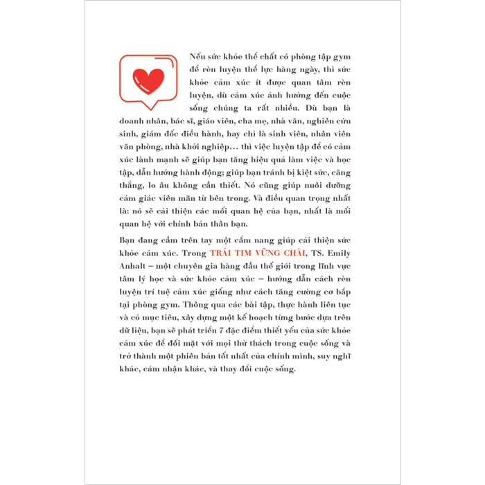 Bạn đang cầm trên tay một cẩm nang giúp cải thiện sức khỏe cảm xúc. Trong TRÁI TIM VỮNG CHÃI, TS. Emily Anhalt - một chuyên gia hàng đầu thế giới trong lĩnh vực tâm lý học và sức khỏe cảm xúc - hướng dẫn cách rèn luyện trí tuệ cảm xúc giống như cách tăng cường cơ bắp tại phòng gym. Thông qua các bài tập, thực hành liên tục và có mục tiêu, xây dựng một kế hoạch từng bước dựa trên dữ liệu, bạn sẽ phát triển 7 đặc điểm thiết yếu của sức khỏe cảm xúc để đối mặt với mọi thử thách trong cuộc sống và trở thành một phiên bản tốt nhất của chính mình, suy nghĩ khác, cảm nhận khác, và thay đổi cuộc sống.
