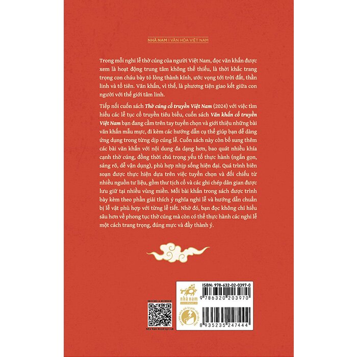 Tiếp nối cuốn sách Thờ cúng cổ truyền Việt Nam (2024) với việc tìm hiểu các lễ tục cổ truyền tiêu biểu, cuốn sách Văn khấn cổ truyền Việt Nam bạn đang cầm trên tay tuyển chọn và giới thiệu những bài văn khấn mẫu mực, đi kèm các hướng dẫn cụ thể giúp bạn dễ dàng ứng dụng trong từng dịp cúng lễ. Cuốn sách này còn bổ sung thêm các bài văn khấn với nội dung đa dạng hơn, bao quát nhiều khía cạnh thờ cúng, đồng thời chú trọng yếu tố thực hành (ngắn gọn, sáng rõ, dễ vận dụng), phù hợp nhịp sống hiện đại. Quá trình biên soạn được thực hiện dựa trên việc tuyển chọn và đối chiếu từ nhiều nguồn tư liệu, gồm thư tịch cổ và các ghi chép dân gian được lưu giữ tại nhiều vùng miền. Mỗi bài khấn trong sách được trình bày kèm theo phần giải thích ý nghĩa nghi lễ và hướng dẫn chuẩn bị lễ vật phù hợp với từng lễ tiết. Nhờ đó, bạn đọc không chỉ hiểu sâu hơn về phong tục thờ cúng mà còn có thể thực hành các nghi lễ một cách trang trọng, đúng mực và đầy thành ý.
