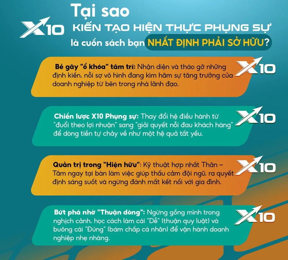 Làm thế nào để bứt phá kết quả gấp 10 lần mà không phải đánh đổi bằng sự kiệt sức hay những đêm mất ngủ? Cuốn sách "X10 - Kiến tạo hiện thực phụng sự" của bộ đôi tác giả Phạm Duy Hiếu và Đặng Hằng chính là lời giải cho nghịch lý này.